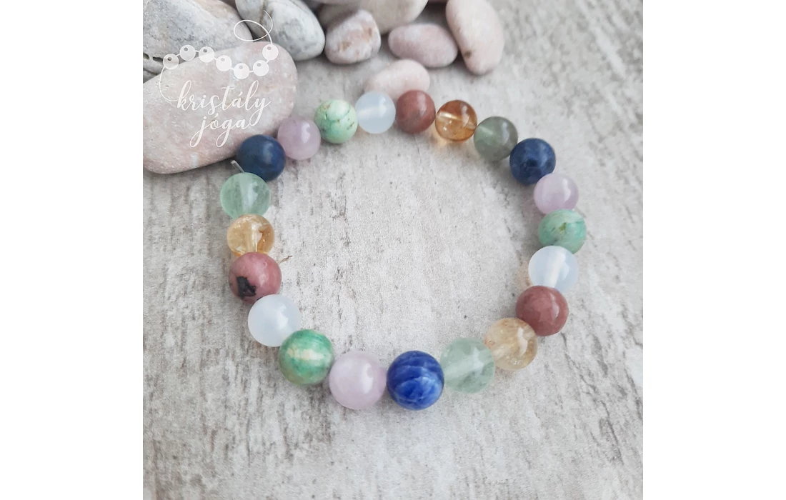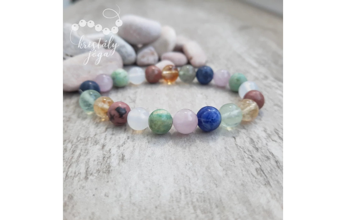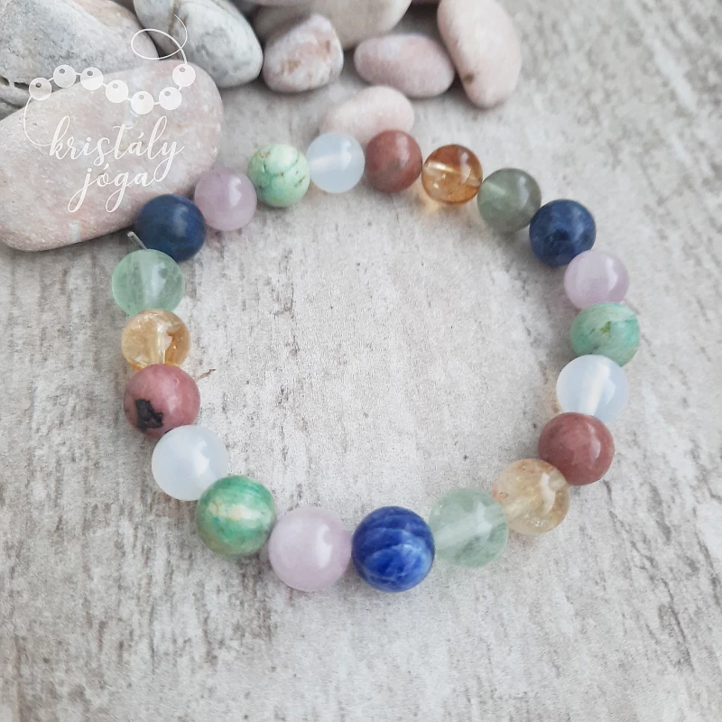 A karkötő ásványai: kunzit, fluorit, türkiz, rodonit, szodalit, achát, citrin.